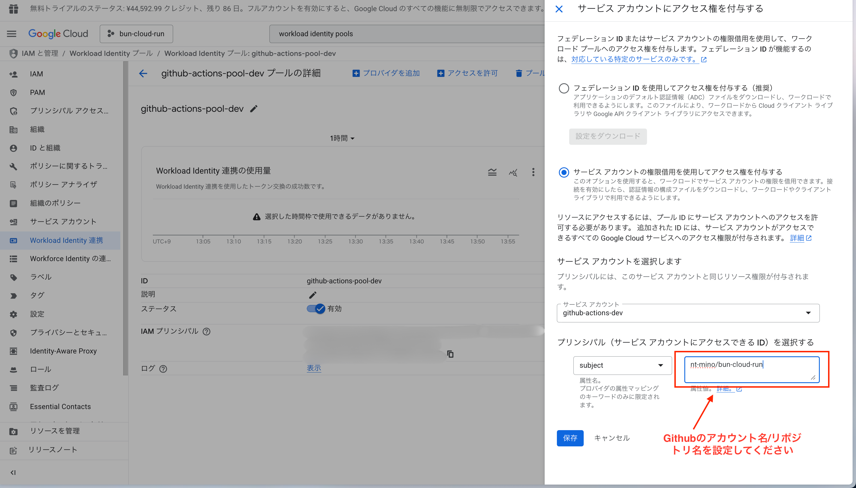 最後に、作成したサービスアカウントにアクセス権限を設定します。特定のGitHubリポジトリからのアクセスのみを許可するよう制限をかけることができます。
