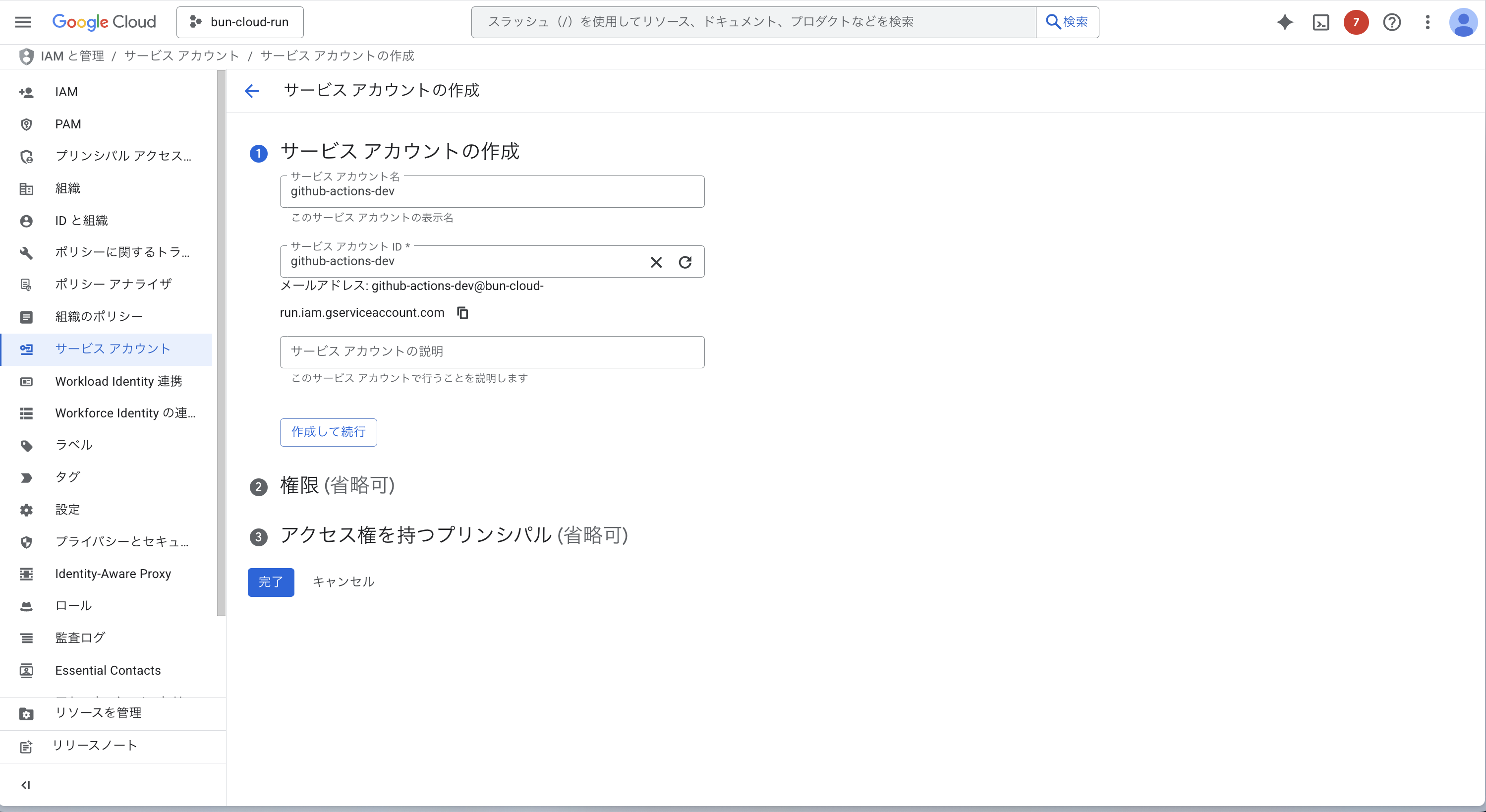 新しいサービスアカウントを作成し、github-actions-dev のような分かりやすい名前を設定してください。