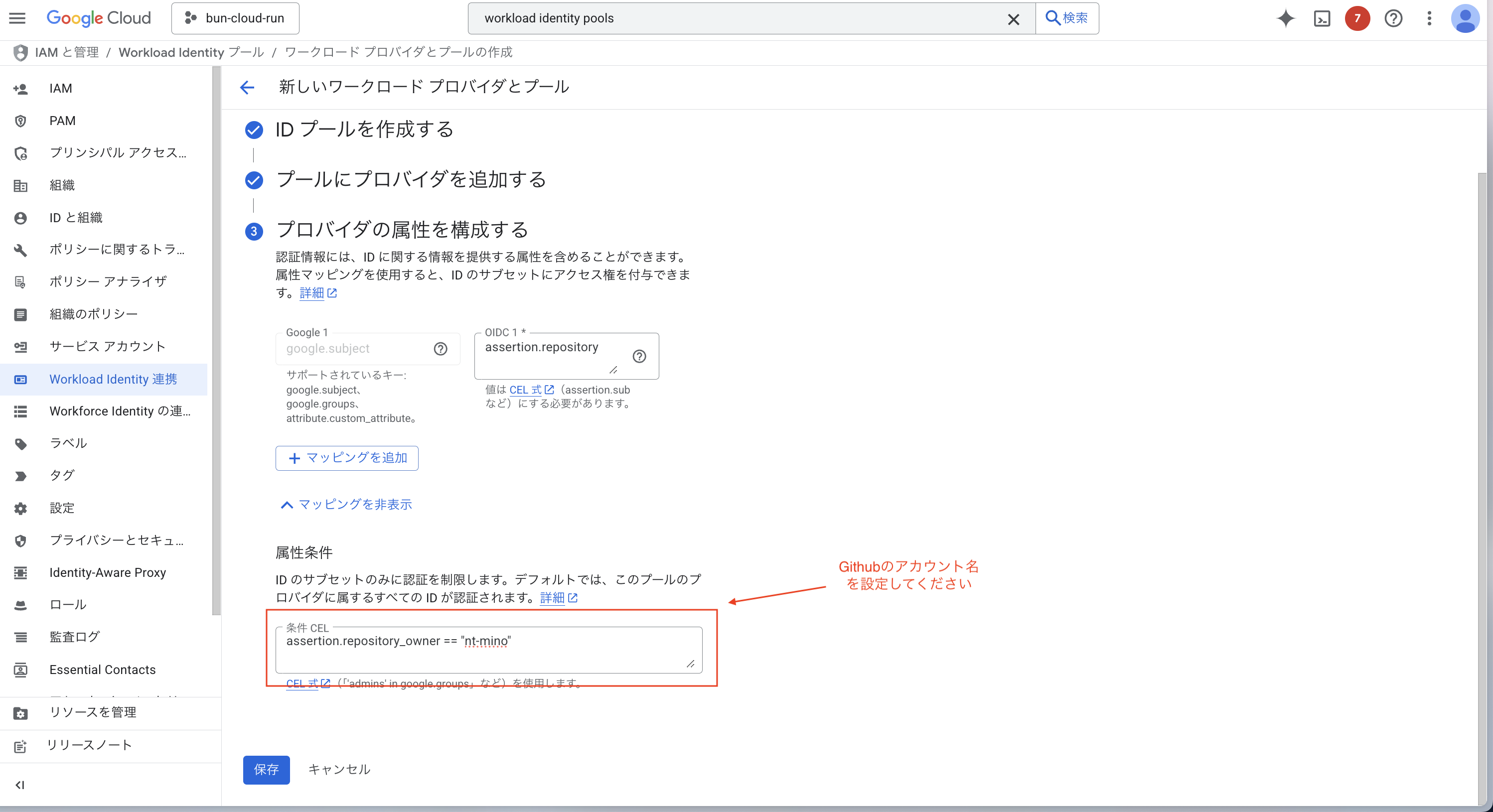 プロバイダの属性構成ではマッピングを google.subject = assertion.repository に設定して、属性条件を assertion.repository_owner == "Githubアカウント名(組織名)” に設定してください。
