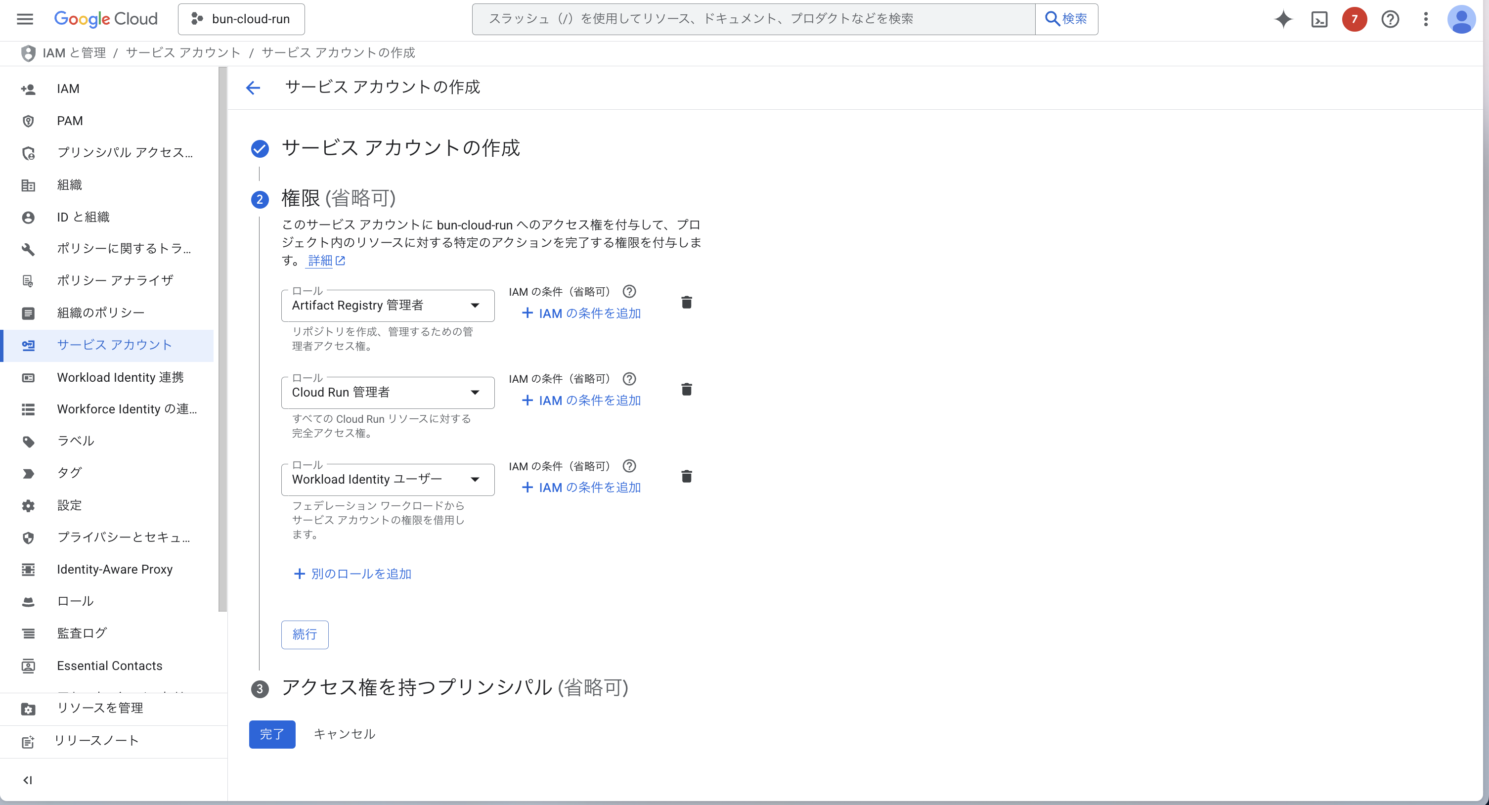 「Artifact Register 管理者」「Cloud Run 管理者」「Wokload Identity ユーザー」の3つをロールとして付与してください。