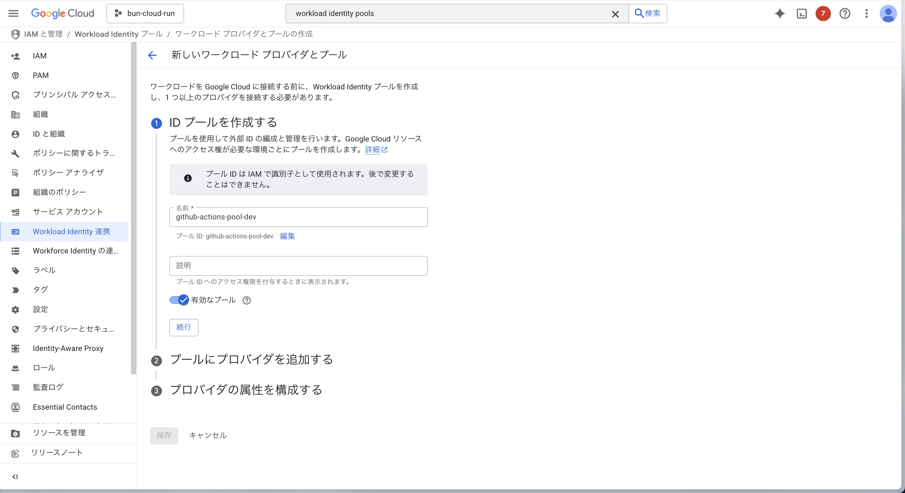まずIDプールを作成します。プール名は github-actions-pool-dev などの識別しやすい名前を設定してください。