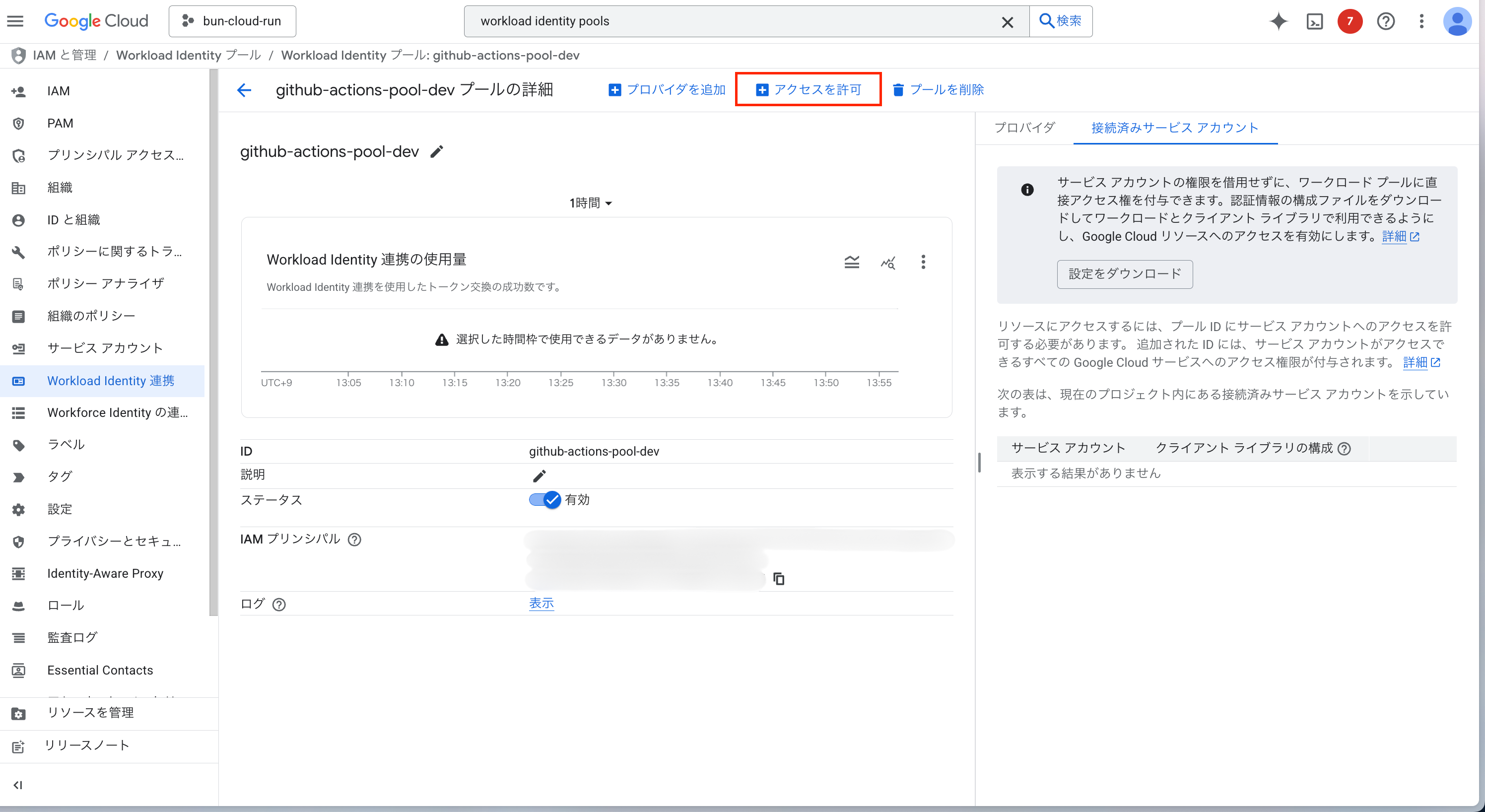 GitHub ActionsからGoogle Cloudにアクセスするための認証設定を行います。